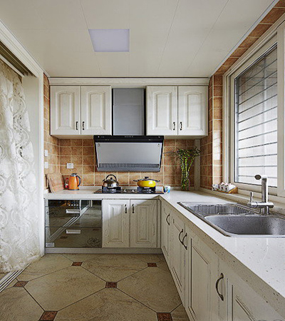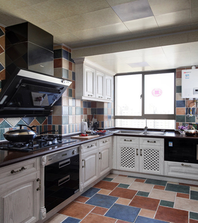 寬敞明亮的廚房。復古的地中海風地磚與櫥柜顯出清爽,側吸的油煙機黑色板面時尚大氣。
