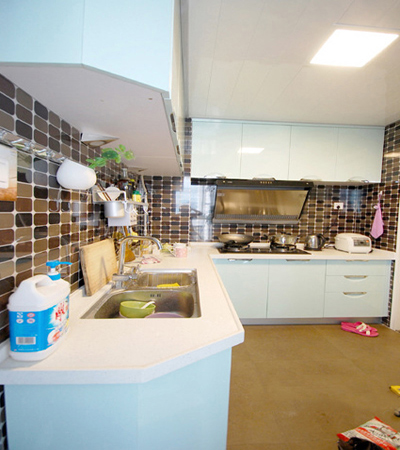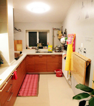 L形的廚房,玻璃的移門。做飯時還能拉上門簾。