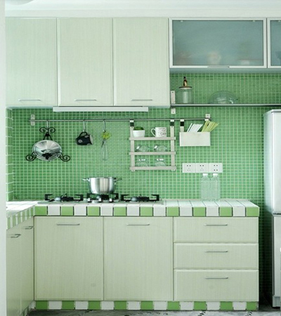 開放式的廚房能節省不少空間,蘋果綠色很漂亮,桌靠墻擺放 留出的過道恰恰好。