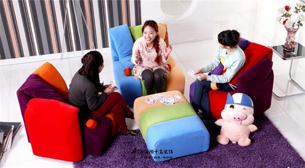 沙發的通體設計是糖果色為主,各種飽和度高的顏色使用在沙發的設計中,周邊的軟裝配飾也要搭配上顏色艷麗的色彩,像是壁畫、地毯、邊幾等等,不僅吸睛更是與沙發的設計融為一體,保證空間配色的完整感。