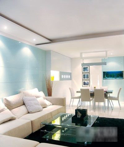在這個客廳中,吊頂上的小射燈有效補充了光線,同時在沙發(fā)背景墻上形成一道美麗的弧形光暈。