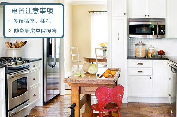 通常擺放在廚房的電器很多,冰箱、微波爐、烤箱、洗碗柜有時候也將熱水器放置在廚房中。這樣廚房的電壓就比較大,在廚房裝修注意事項中一定注意此項,裝修時應預留多的插孔。